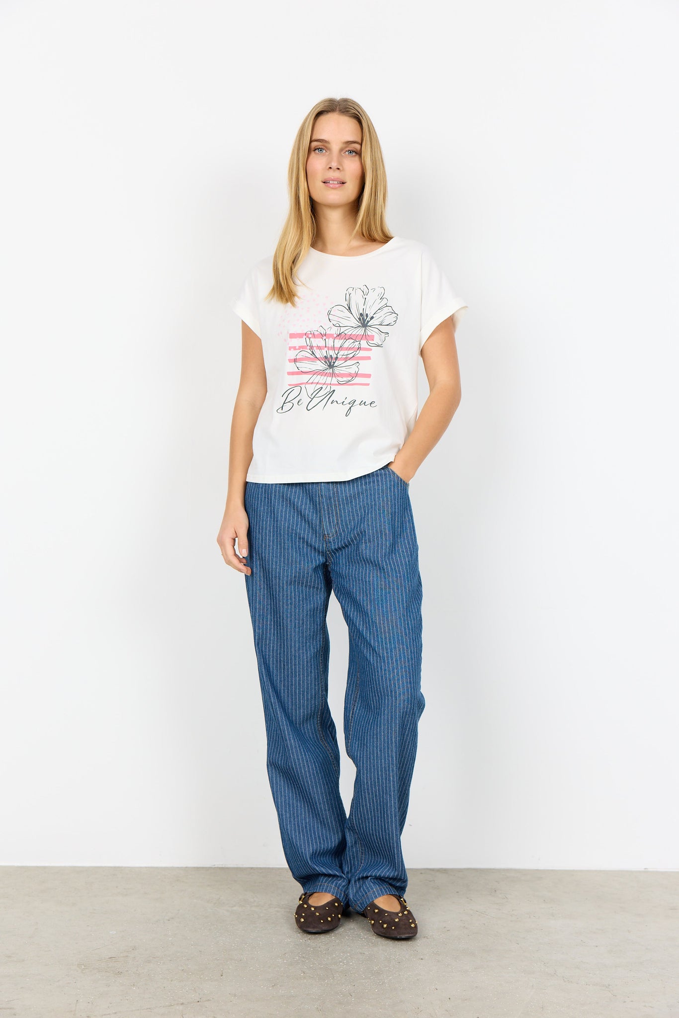 Ce t-shirt graphique présente un superbe dessin de fleurs sur un ton rose. Son col rond offre un style classique et facile à porter. Confectionné dans un tissu composé de 95 % coton et de 5 % élasthanne, il est confortable et procure une légère élasticité qui accompagne les mouvements. Le coton, fibre naturelle, est respirant et absorbe l’humidité, ce qui le rend agréable à porter au quotidien. Ce chandail se porte parfaitement avec un jean et convient très bien pour une sortie décontractée.
