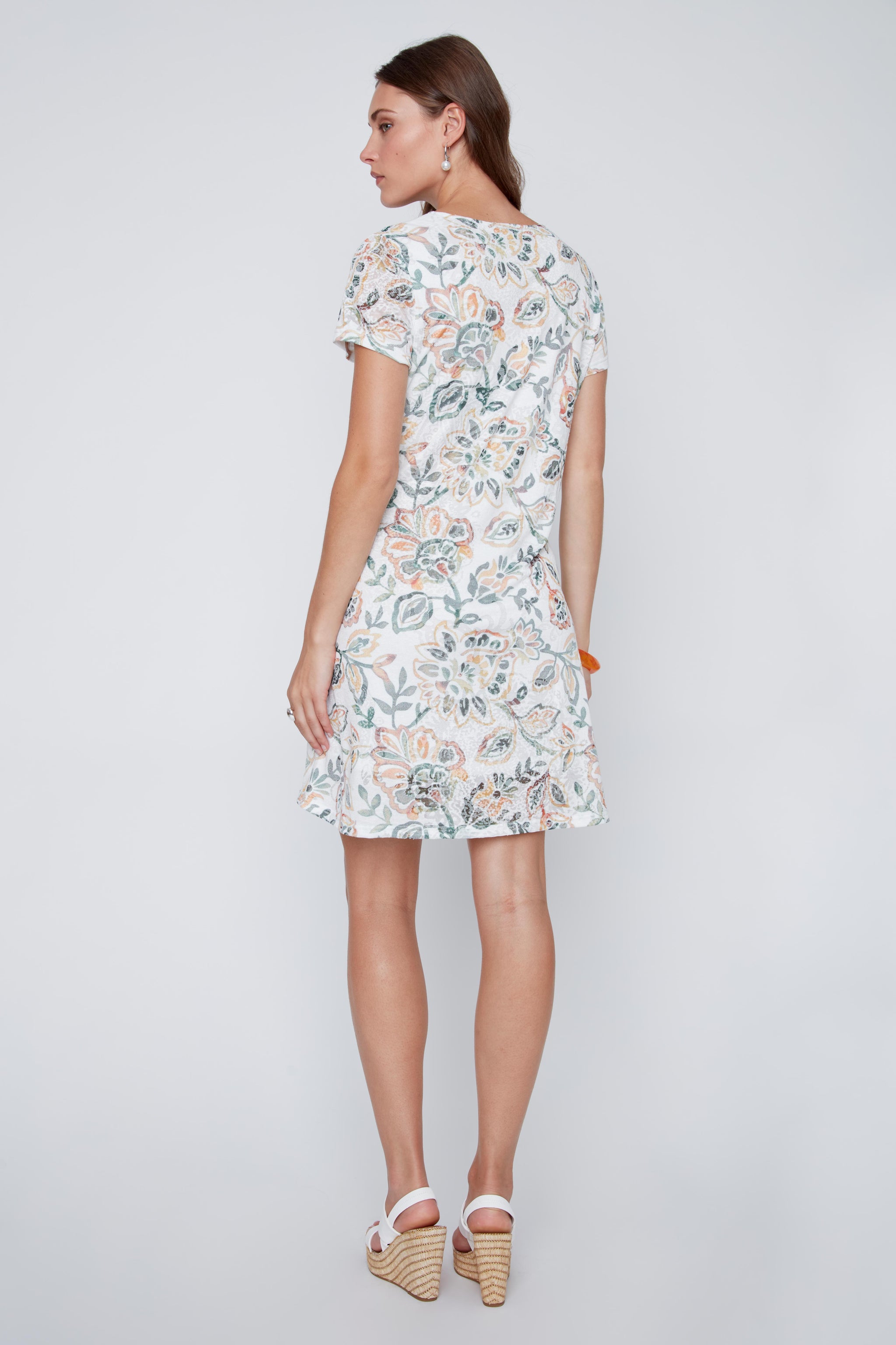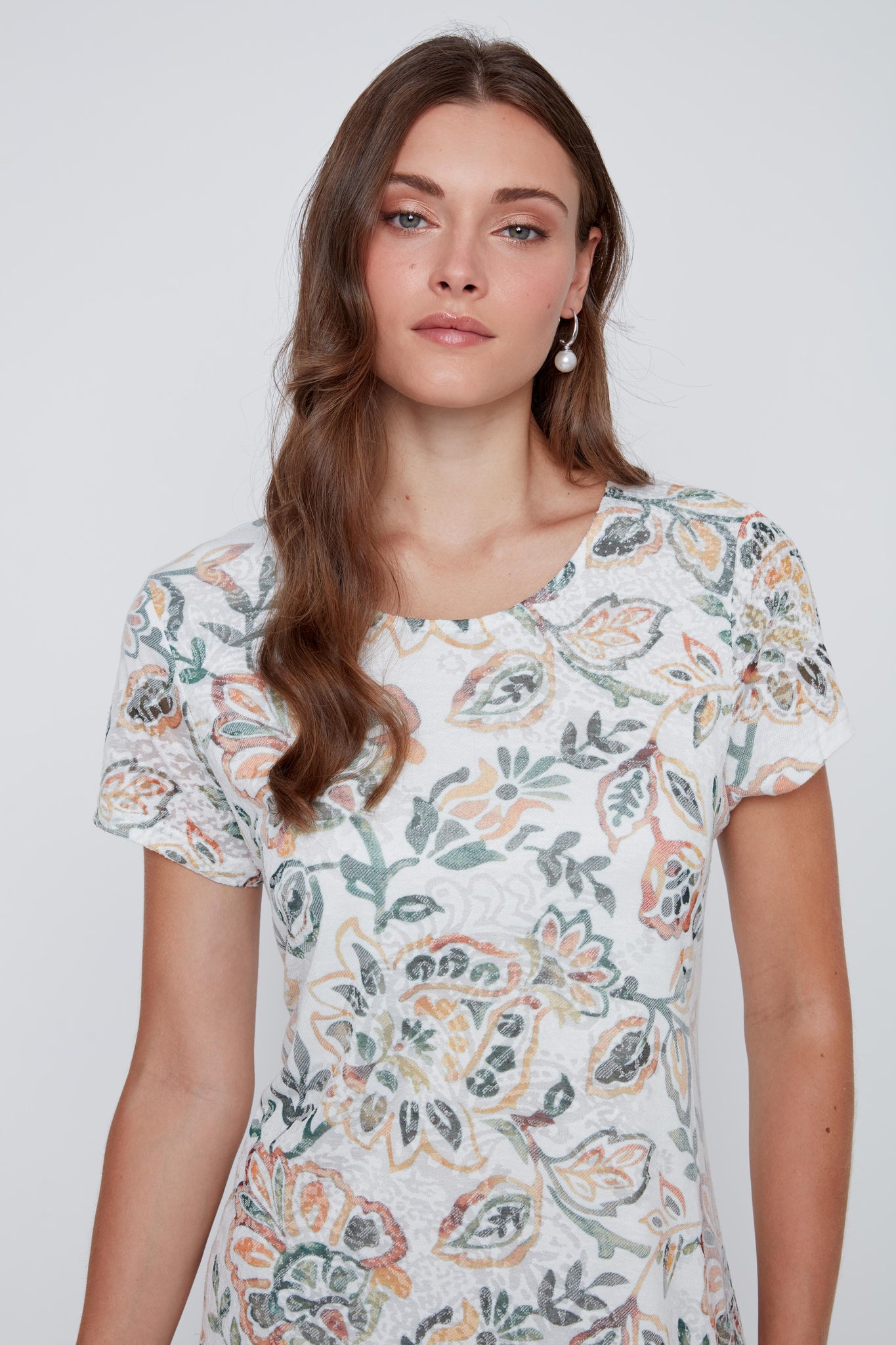 Cette robe T-shirt à col rond se distingue par son magnifique imprimé floral dans des tons pastel doux et lumineux. Son style simple et soigné en fait une pièce facile à intégrer à votre garde-robe.