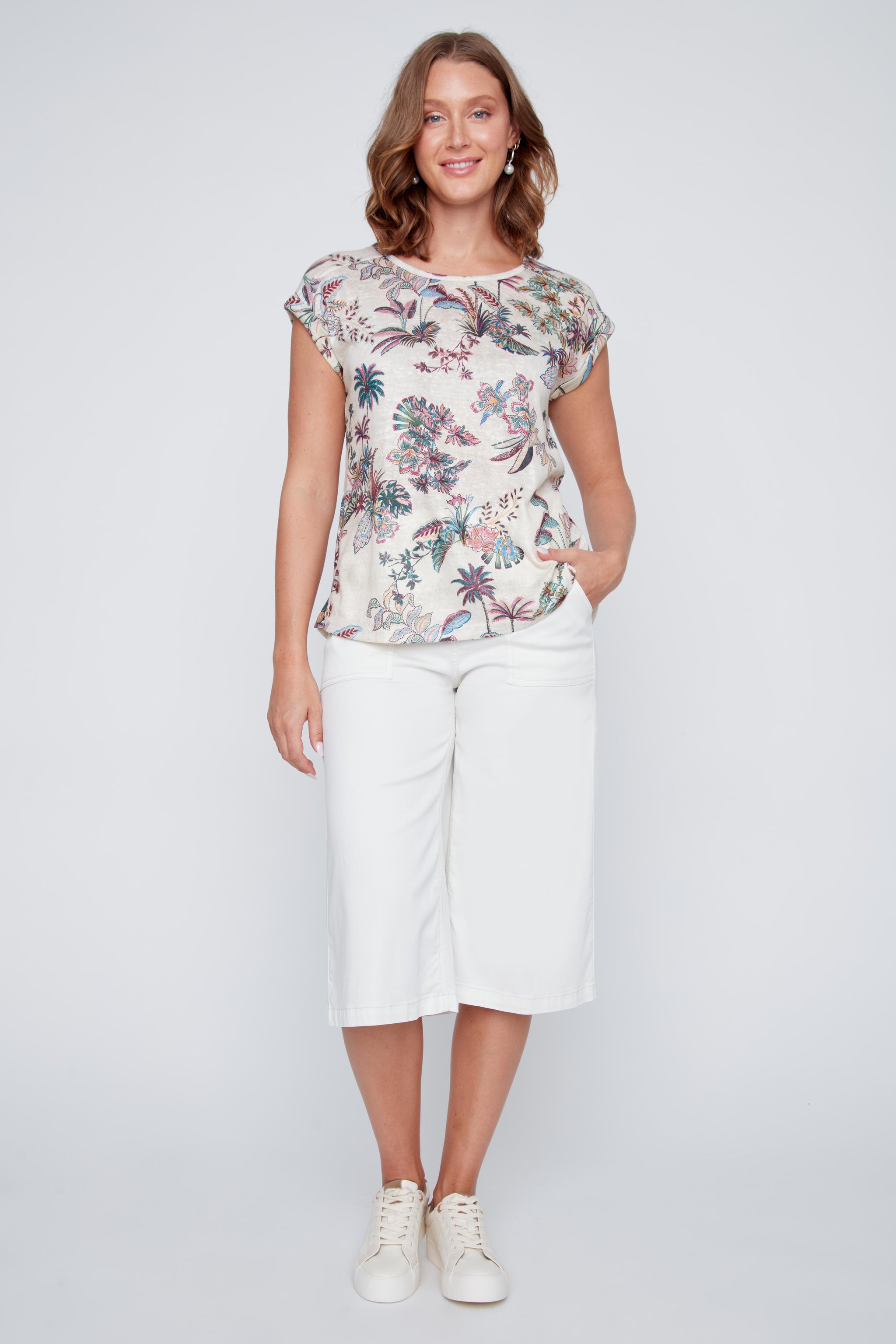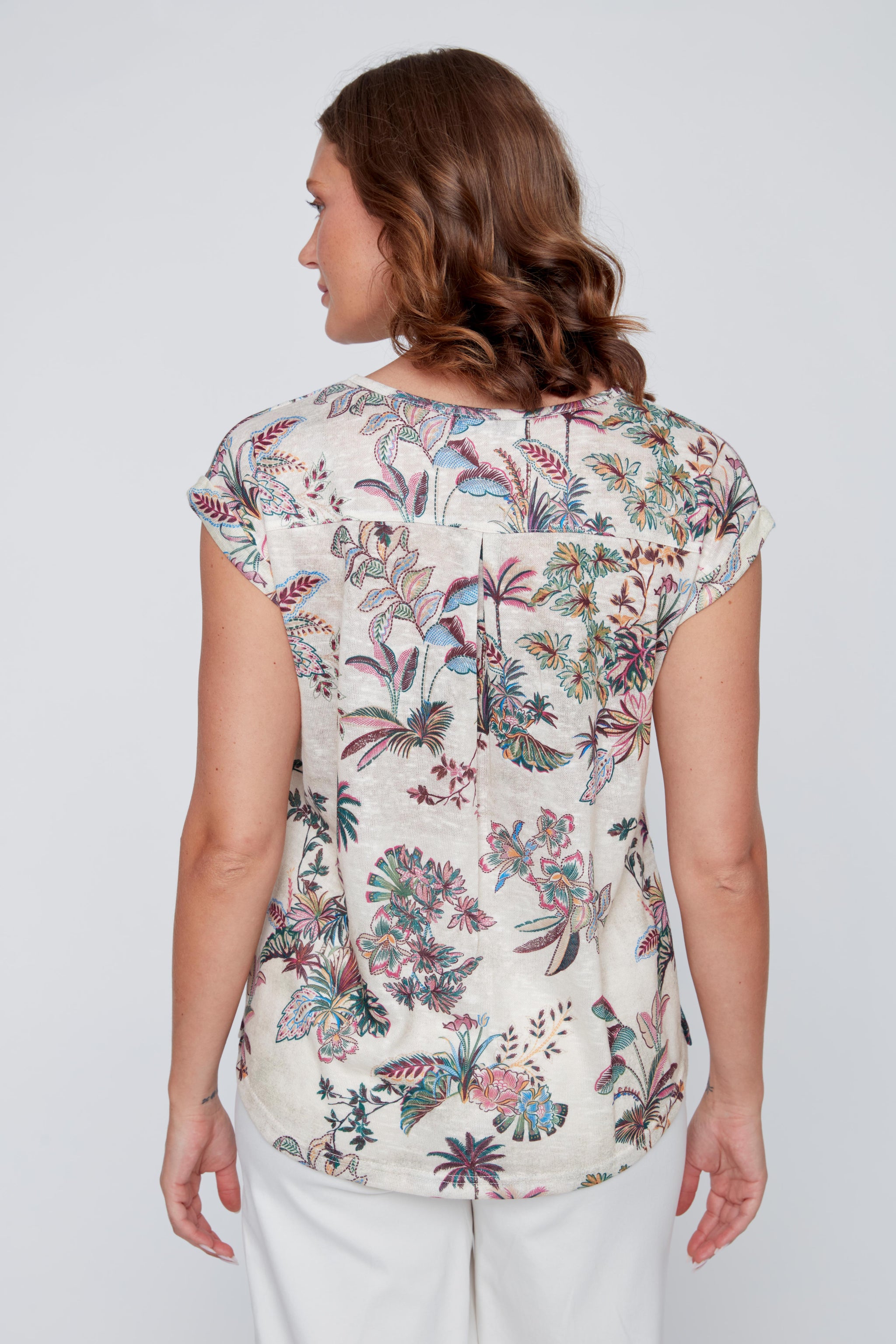 Ce T-shirt à col rond de la compagnie CYC se distingue par sa couleur écrue lumineuse et son imprimé tropical estival dans des teintes de rose et de vert. Son motif apporte fraîcheur et douceur à votre tenue.