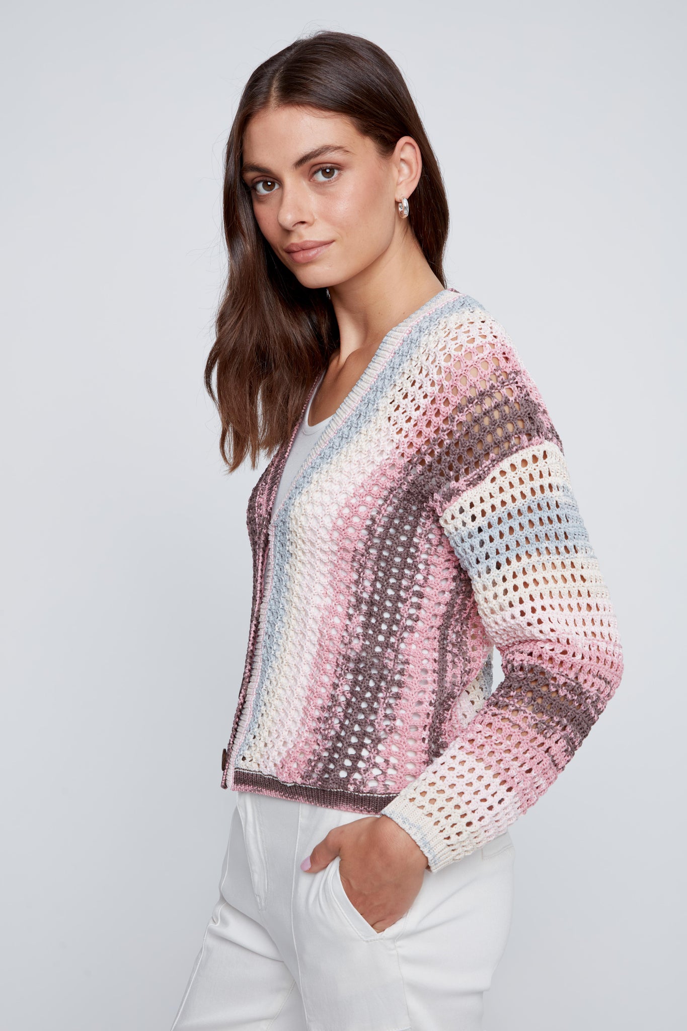 Ce cardigan en crochet multicolore de la compagnie CYC se distingue par son harmonieux mélange de bleu, de rose et de taupe et ivoire. Son jeu de couleurs apporte douceur et féminité à vos tenues, tout en restant facile à agencer.